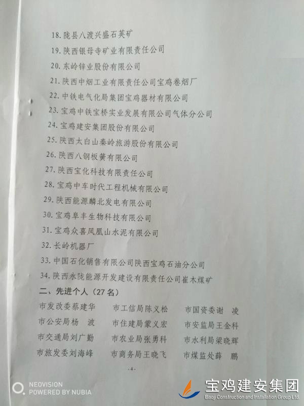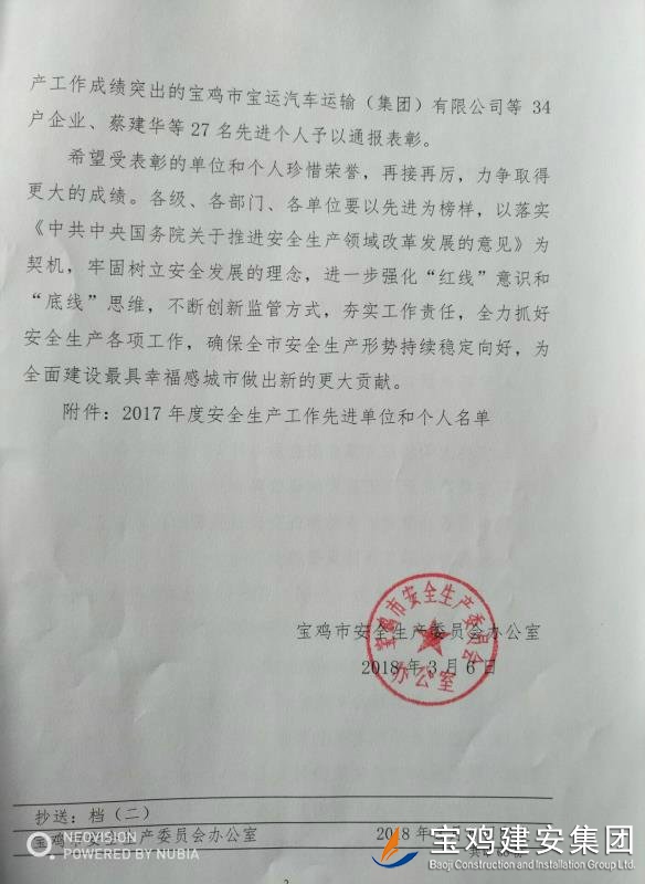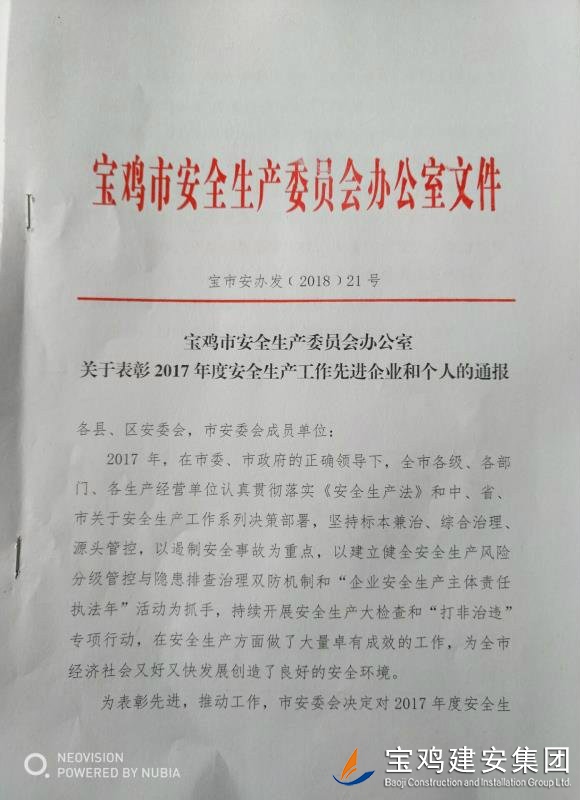 近期,寶雞市安委會對2017年度安全生產(chǎn)先進(jìn)單位進(jìn)行了通報(bào),我單位在考核中以優(yōu)異的成績獲得了此項(xiàng)殊榮。當(dāng)然,取得這樣的成績,離不開各級領(lǐng)導(dǎo)的正確決策和基層單位的艱辛付出,公司安委會在此表示感謝。 2017年,公司始終圍繞在國家的大政方針框架下,積極展開以《安全生產(chǎn)法》及相關(guān)規(guī)范標(biāo)準(zhǔn)為核心的安全工作,堅(jiān)持標(biāo)本兼治、綜合治理、源頭管控,以遏制安全事故為重點(diǎn),建立健全安全生產(chǎn)風(fēng)險(xiǎn)分級管控與隱患排查治理雙重機(jī)制,持續(xù)開展安全生產(chǎn)專項(xiàng)檢查,杜絕了惡性事故的發(fā)生。在安全生產(chǎn)標(biāo)準(zhǔn)化建設(shè)中,公司始終以“科技創(chuàng)新、合理投入、擇善而從”為出發(fā)點(diǎn)進(jìn)行部署管理,通過系統(tǒng)管理及一系列舉措,使公司安全管理走在本土行業(yè)前列,且在多次檢查驗(yàn)收中,獲得省、市級領(lǐng)導(dǎo)的點(diǎn)贊。 九牛一毫莫自夸 驕傲自滿必翻車,成績只代表過去,2018年,我們要完善不足,戒驕戒躁,砥礪前行。 寶雞建安集團(tuán)股份有限公司安委會 2018年4月25日