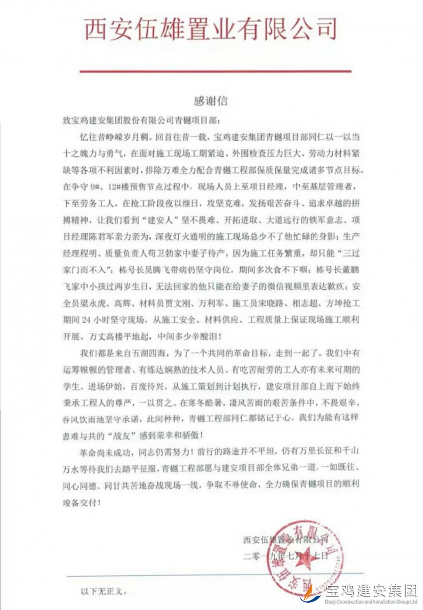 2019年7月17日,我公司路橋項(xiàng)目部承建的中南青樾項(xiàng)目收到由建設(shè)單位西安伍雄置業(yè)有限公司發(fā)出的一封感謝信,信中言辭懇切,對(duì)路橋公司青樾項(xiàng)目管理人員給出了極高的評(píng)價(jià)。在面對(duì)施工現(xiàn)場(chǎng)工期緊迫、資金短缺、外圍檢查壓力巨大、勞動(dòng)力材料緊缺等各項(xiàng)不利因素時(shí),寶雞建安集團(tuán)青樾項(xiàng)目部各位同仁克服自身困難、艱苦奮斗、不畏艱難以一當(dāng)十之魄力與勇氣保質(zhì)保量并按工期節(jié)點(diǎn)完成了施工任務(wù)。