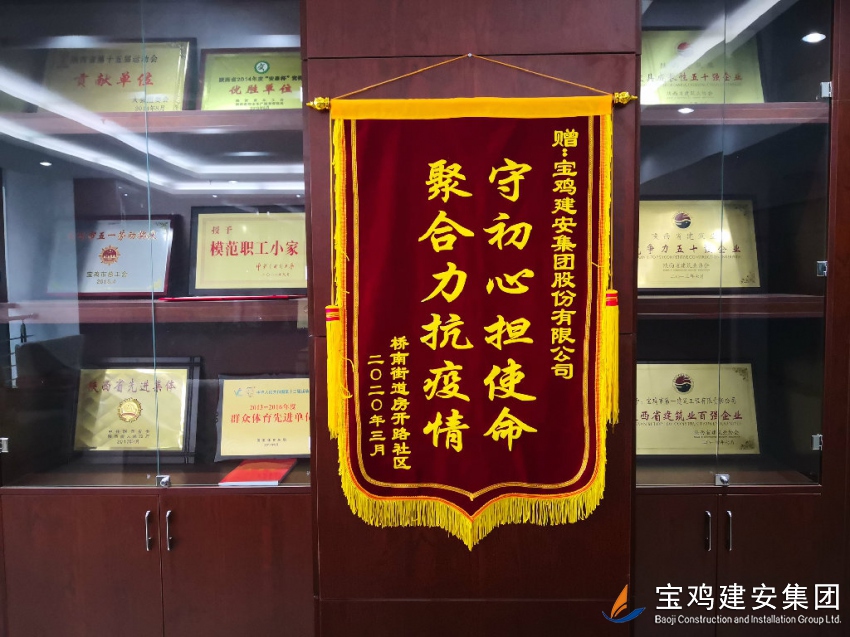 4月1日上午,寶雞建安大廈21樓舉行了一場簡單而熱烈的贈旗活動。橋南街道辦事處房開路社區(qū)馮書記、王主任等三人代表社區(qū)所管轄的廣大居民,給寶雞建安集團(tuán)股份有限公司送來一面“守初心擔(dān)使命、聚合力抗疫情”的錦旗,贊揚(yáng)寶雞建安集團(tuán)公司在新冠肺炎疫情防控工作中對社區(qū)工作的支持和幫助。公司黨委書記、總經(jīng)理、工會主席等參加活動。