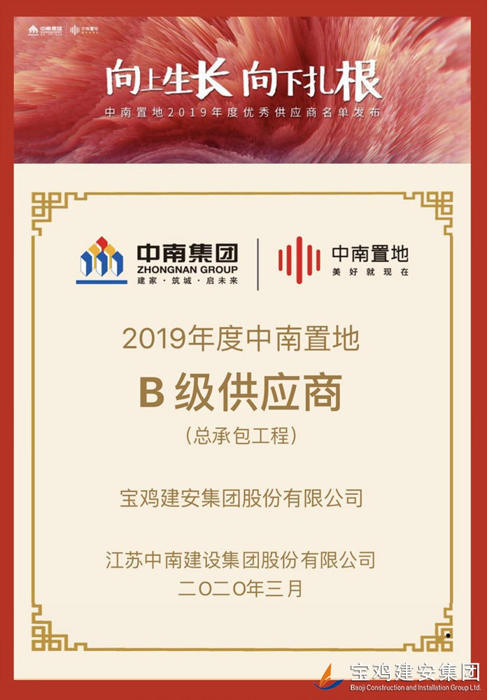 “中南置地2019年度優(yōu)秀供應(yīng)商”由中南置地設(shè)立,從全國(guó)100座城市360個(gè)標(biāo)桿項(xiàng)目中選出,A級(jí)供應(yīng)商8家,B級(jí)供應(yīng)商36家。寶雞建安集團(tuán)股份有限公司在360個(gè)標(biāo)桿項(xiàng)目中脫穎而出,成為陜西省唯一一家B級(jí)供應(yīng)商。