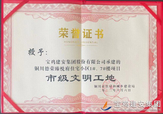 與此同時(shí),由寶雞建安集團(tuán)第四分公司承建的銅川新區(qū)德榮臻悅府小區(qū)項(xiàng)目(距雍照華府項(xiàng)目5公里),也在此次活動(dòng)中,被授予“銅川市文明工地“榮譽(yù)稱號(hào)。