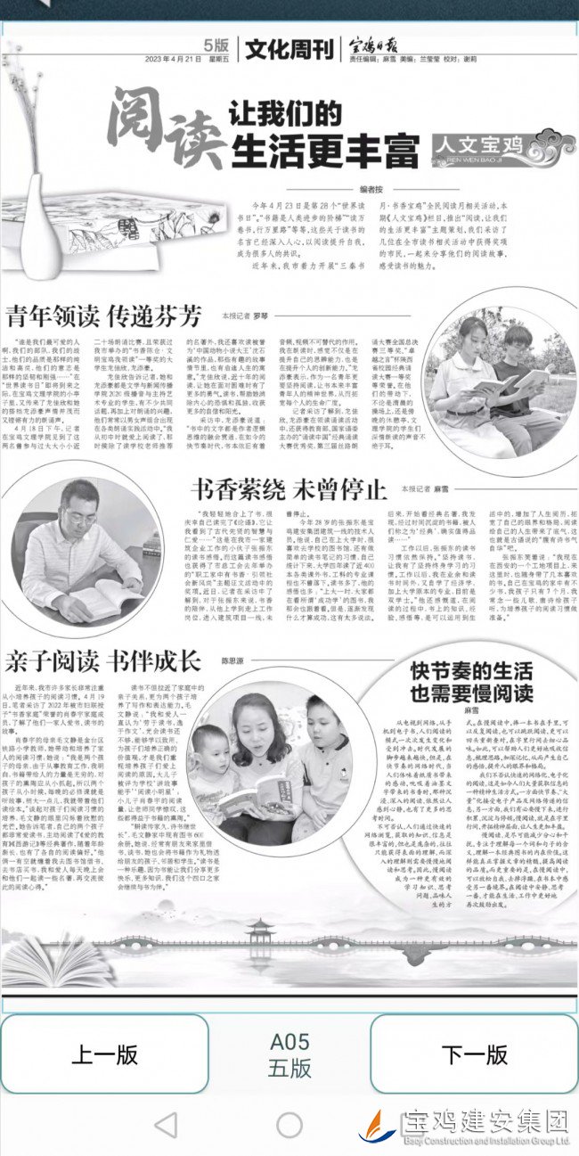 編者按:在第28個(gè)世界讀書日到來之際,《寶雞日?qǐng)?bào)》社策劃了讀書專版,鑒于寶雞建安集團(tuán)工會(huì)長期堅(jiān)持舉辦的“書香企業(yè)”征文活動(dòng)在社會(huì)的影響力與美譽(yù)度,記者來電提出采訪意向,公司工會(huì)極力舉薦了來自基層一線熱愛閱讀并多次參與讀書征文的技術(shù)人員張振東同志。5月21日,《寶雞日?qǐng)?bào)》發(fā)表了這篇小專訪,現(xiàn)予轉(zhuǎn)發(fā)。