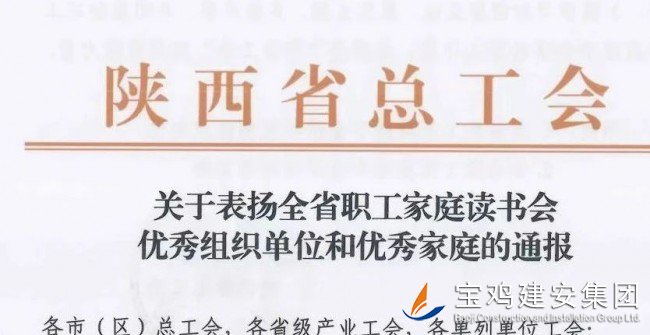 另?yè)?jù)消息,在第28個(gè)“世界讀書日”到來(lái)之際,由市總工會(huì)推薦的全市職工讀書活動(dòng)兩個(gè)代表家庭,被陜西省總工會(huì)授予全省優(yōu)秀單位稱號(hào),寶雞建安集團(tuán)工會(huì)成為代表全市職工讀書活動(dòng)中的典型表率之一,受到全省通報(bào)嘉獎(jiǎng),為寶雞贏得了榮譽(yù)。